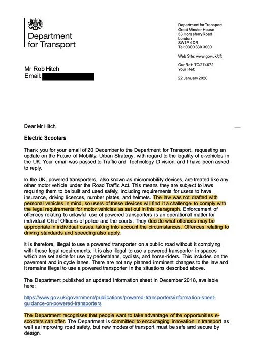 Below is an email response I received from the Department of Transport, surrounding current legalisation of electric scooters and electric unicycles.
