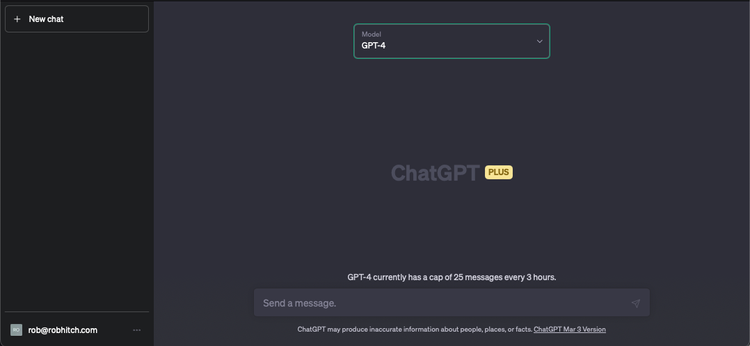 There are two key areas: Left hand column lists each of the “Chats”, with the right side comprising of the main interface where you interact with ChatGPT and receive responses. You simply type your instructions in the “Send a Message” box at the bottom to submit any request.